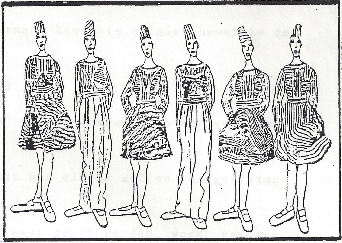 De kleding is een "spel" van vormen, bewerkte en niet bewerkte delen in streep en unie.