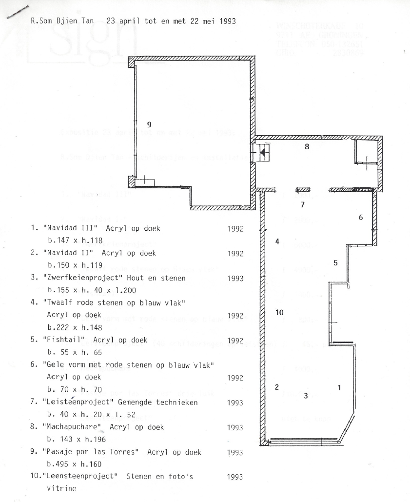 De beschilderde doekjes zijn afkomstig van een doek van negentig bij honderdtien centimeter. Het grote doek is eerst beschilderd en toen gescheurd tot veertig kleine doekjes. De kleine doekjes zijn daarna bijgewerkt en tenslotte per stuk op een leisteen geplakt. Oorspronkelijk behoorden de vlammende stenen bij elkaar op hetzelfde doek. Na een ingreep die, door het scheuren, het wezenlijke karakter van de geweven ondergrond niet aantastte, werden de stenen van elkaar gescheiden. Dezelfde scheiding, van een grote plaat in kleinere plaatjes, heeft plaatsgevonden bij de leistenen. Ook hier is door de manier van ingrijpen, het splijten, het wezenlijke karakter van de steen niet aangetast. Beide ingrepen benadrukken juist de karakters van de gebruikte materialen. De kleine schilderijtjes met vlammende steen op hun leistenen drager zullen per stuk verkocht worden. Het objekt zal hierdoor uiteenvallen en de afzonderlijke elementen zullen verder gescheiden worden. Er zal een geografische spreiding plaatsvinden en ieder element zal een eigen plaats innemen. Het nu tot objekt verworden element zal een wisselwerking aangaan met zijn nieuwe omgeving.