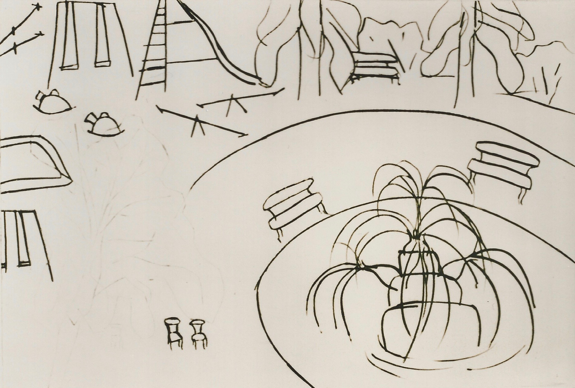 Misschien is dit wel helemaal niet de bedoeling van de kunstenares geweest, maar het werk raakt me en verwijd mijn blikveld en ik geloof daarom niet dat ik met deze interpretatie haar werk geweld aan doe. Ik zou me ook kunnen voorstellen, als ik denk aan "gevoelsmatige indrukken" dat dit werk over een inwendige zonnewende gaat. Wat ik goed vind aan deze droge naald-ets is dat een zuiver formele benadering op zich al interessant is, maar het ook de mogelijkheid bied om dieper door te dringen en vervolgens een zicht geeft op een andere werkelijkheid of kosmos.