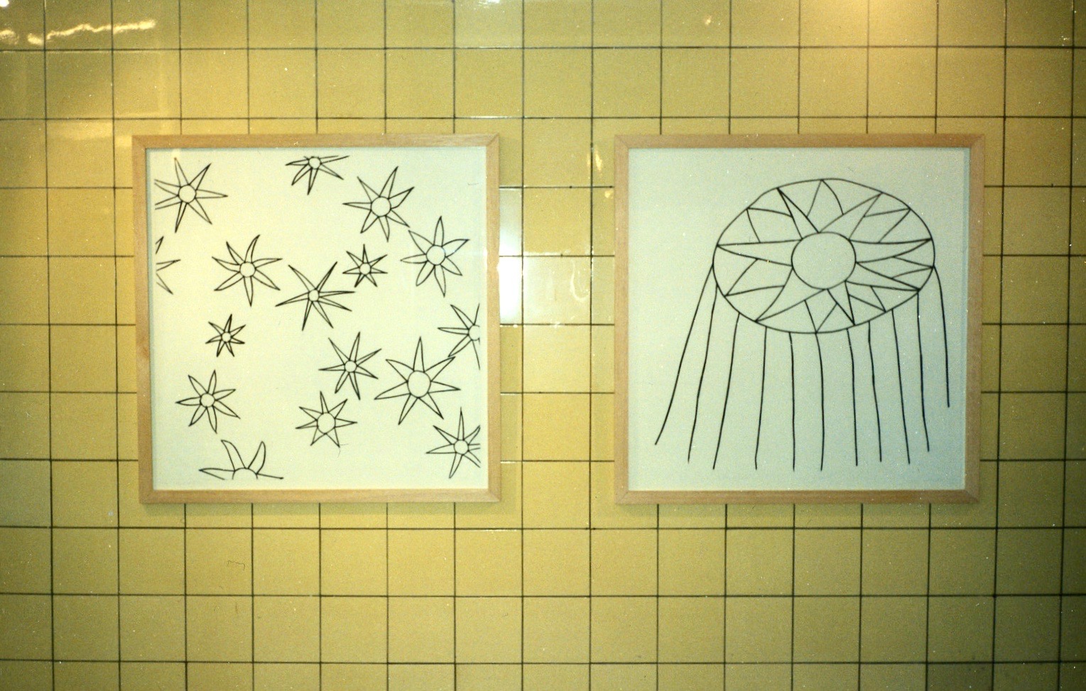 Dat wat ik hiervoor telkens één drogenaald-ets heb genoemd is eigenlijk één beeld bestaande uit een grote ets omringd door 12 kleine etsen. Allen zijn ze ingelijst in een houten frame met glas ervoor. De grote ets (formaat 50 x 50 cm.) hangt in het midden. De 12 kleine etsen (formaat 25 x 25 cm.) zijn er nauwsluitend om heen gegroepeerd, zodanig dat alle etsen samen één groot vierkant vormen.