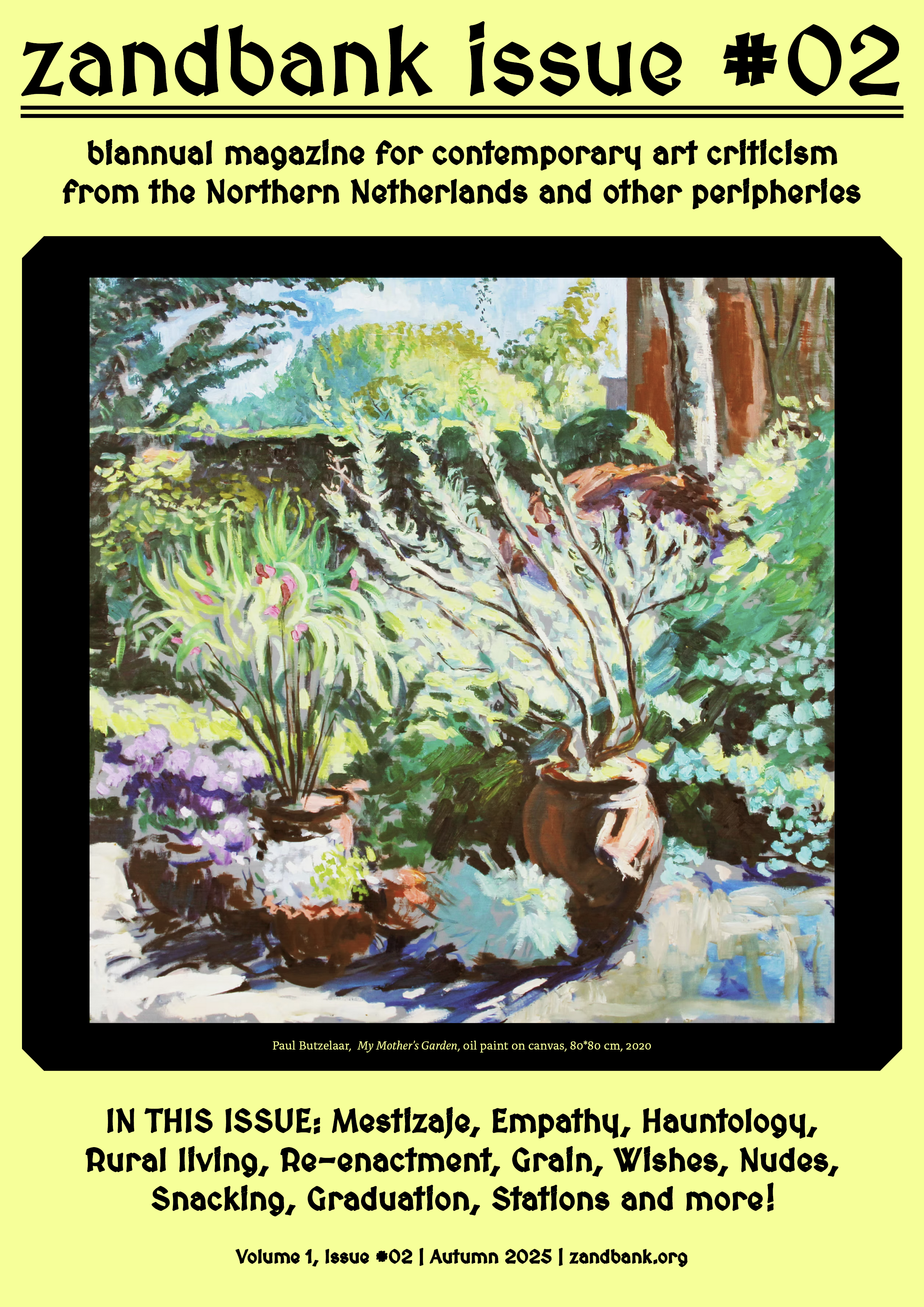 Issue #02 is a collection of current and recent art writing, connected through shared interests such as mestizaje, empathy, hauntology, rural living, re-enactment, grain, wishes, nudes, snacking, graduation and stations. The magazine contains new writing as well as re-publications. It also includes two translated articles from the magazine Neonthal, which was active in Groningen 1989-1990.