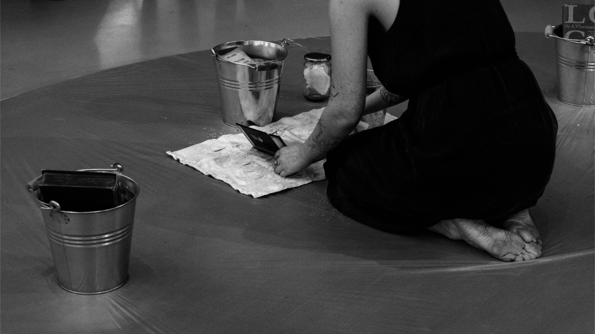 This composting, which (eco)feminist artists began, brings me back to weaving. Weaving in rituals. I recall, in 2024, during the Night of Philosophy, on the 19th of April, I was kneeling and washing Western philosophy books. The audience, who came to listen to Western-based philosophers, could watch me washing. I knelt and soaked seven books in water for two and a half hours. This was the performance that stepped outside being a mere representation of my critique and anger towards Western epistemologies; it stood as a ritual in which I negotiated the fine line of destruction and renewal. It was a ritual in which the water I used resisted my conceptual implications –the ink did not wash off from the books– but rather became my collaborator in re-thinking and shifting my critique. I found myself partaking in a ritual of unlearning –all that was mentally loosely scripted and prepared for the performance was gone.