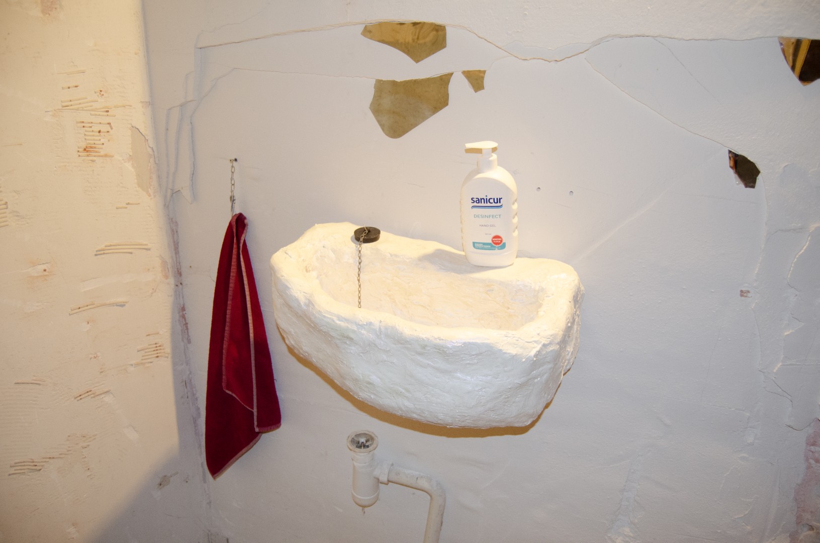 Indira de Boer & Jorien Ketelaar, a summer away from running water, plaster, metal wire, drain plug, towel, mirror and lamp.